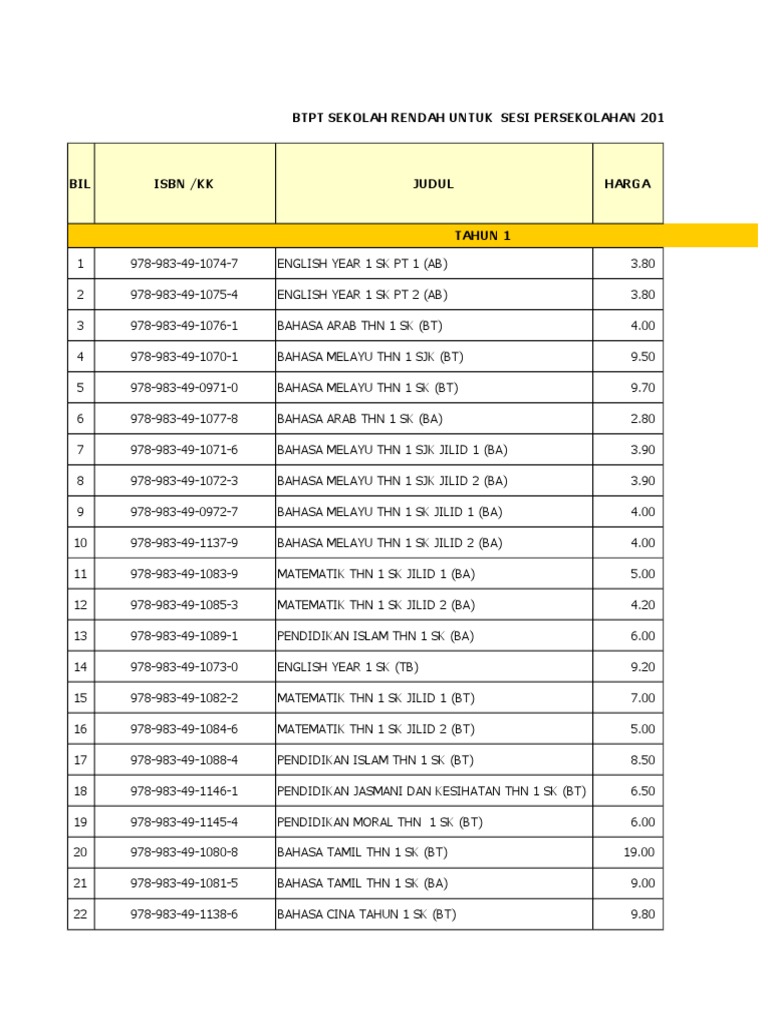 Semak bagi judul buku dan juga senarai harga buku bagi tahun 1 hingga 6. Pembelajaran kendiri adalah diutamakan dalam buku ini supaya murid dapat mentaksir. Senarai Judul Buku Teks 2019.