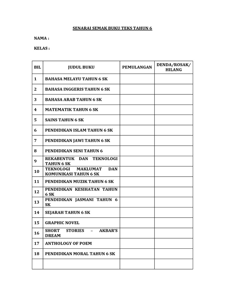 Senarai Semak Buku Teks Tahun 6 Pdf